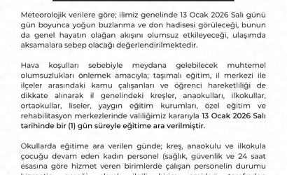 "Hava koşulları sebebiyle meydana gelebilecek olumsuzları önlemek amacıyla taşımalı eğitim, il merkezi ile ilçeler arasındaki kamu çalışanları ve öğrenci hareketliliği de dikkate alınarak il genelindeki kreşler, anaokulları, ilkokullar, ortaokullar, liseler, yaygın eğitim, özel eğitim ve rehabilitasyon merkezlerinde valiliğimiz kararıyla 13 Ocak Salı günü eğitime 1 gün süreyle ara verilmiştir."