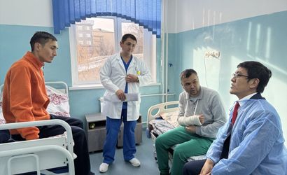 Kazakistan'da düşen Azerbaycan Hava Yolları'na (AZAL) ait uçaktan yaralı kurtulan 3 Kırgızistan vatandaşı, başkent Bişkek'e getirildi. Bakanlar Kurulu Başkan Yardımcısı Edil Baysalov (sağda), hastanede tedavileri süren yaralıları ziyaret etti.