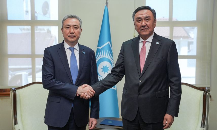 Kazakistan’ın Türk Devletleri Teşkilatı (TDT) Daimi Temsilcisi olarak atanan Kazakistan'ın Ankara Büyükelçisi Yerkebulan Sapiyev (solda), güven mektubunu Türk Devletleri Teşkilatı (TDT) Genel Sekreteri Kubanıçbek Ömüraliyev'e (sağda) takdim etti.