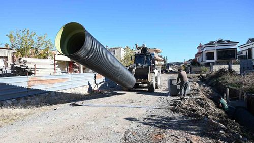Kemer Belediyesi Fen İşleri, Kuzdere Mahallesi 38. Cadde’de 350 metrelik imar yolunda 800’lük koruge boru ile yağmur suyu drenaj hattı döşüyor; ardından kaldırım ve kilitli parke çalışmaları başlayacak.