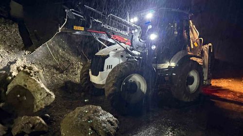 Antalya Kemer’in Yayla Kuzdere yolunda dün akşam yağmur nedeniyle istinat duvarı çöktü; Kemer Belediyesi ekipleri yolu açıp mahsur kalan aracı kurtardı.