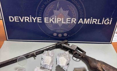 Yapılan aramada 19 gram uyuşturucu madde ve 1 ruhsatsız av tüfeği ele geçirildi.