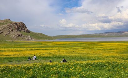 Van'ın Gürpınar ilçesinde Erek Dağı eteklerinde bulunan ve çevresi sarı çiçeklerle bezenen 2 bin 500 rakımlı Keşiş Gölü (Turna), doğal güzelliğiyle ziyaretçilerini karşılıyor.