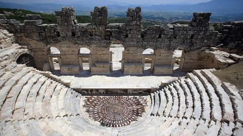 Kibyra Antik Kenti'ndeki Geç Roma dönemi Medusa Mozaiği, kış koruması sonrası restorasyonla ziyaretçilere açıldı; Tholos Nymphaion'dan su akışı yeniden başladı.