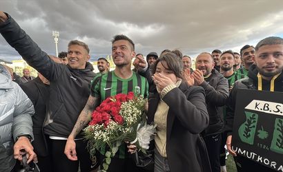Bölgesel Amatör Lig ekiplerinden Kilis Belediyespor'da forma giyen futbolcu, maç sonrası sahada kız arkadaşına sürpriz evlenme teklifinde bulundu. Kilis Belediyespor oyuncusu Umut Koray Öz(Sol 2), takımının 4-0 galip geldiği maç sonunda, kız arkadaşı Bilhan Şahin(Sağ 2)'e evlenme teklifinde bulundu.
