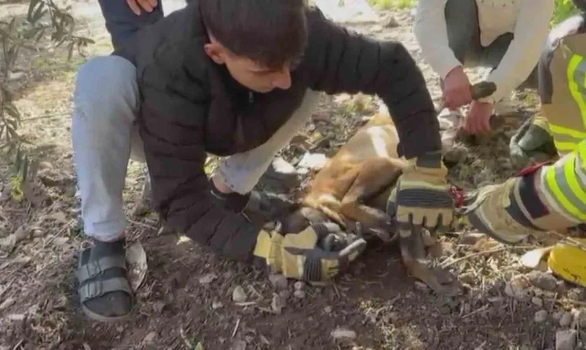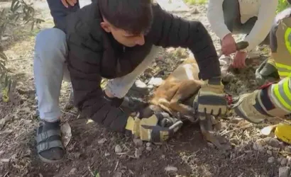 Hatay'ın Kırıkhan ilçesi Gündüz Mahallesi'nde bahçesinde beslenen bir köpeğin patisi zincire sıkıştı. Sıkışan zinciri kendi çabasıyla çıkaramayan sahibi durumu itfaiye ekiplerine bildirdi.