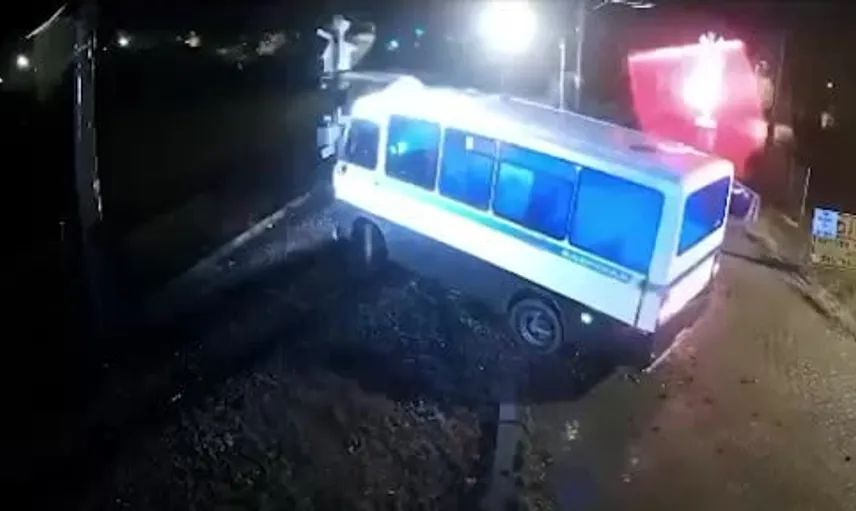 Güvenlik kamerasına yansıyan görüntülerde, sürücünün tren gelmeden kısa süre önce araçtan inerek son anda kurtulduğu görülüyor. Çarpmanın etkisiyle araç metrelerce savruldu ve dolmuşta ağır hasar meydana geldi.