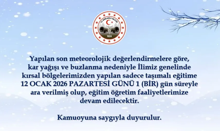 Kırklareli Valiliği tarafından yapılan son meteorolojik değerlendirmeler sonucunda, il genelinde etkili olması beklenen kar yağışı ve buzlanma nedeniyle ulaşımda aksamalara yol açabileceği değerlendirilmiştir. Bu çerçevede, kırsal bölgelerden yapılan taşımalı eğitime 12 Ocak 2026 Pazartesi günü 1 gün süreyle ara verilmiştir.