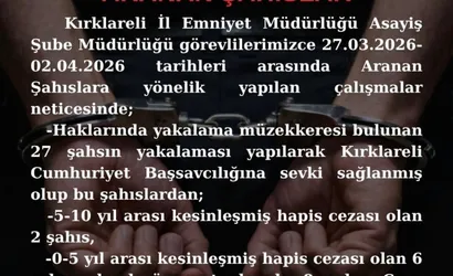 Kırklareli İl Emniyet Müdürlüğü Asayiş Şube Müdürlüğü ekiplerince aranan şahıslara yönelik yapılan operasyonlarda, il genelinde yürütülen takip ve yakalamalar sonucunda önemli bir adım atıldı.