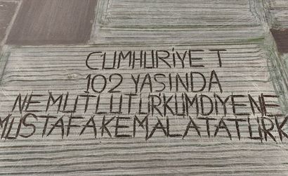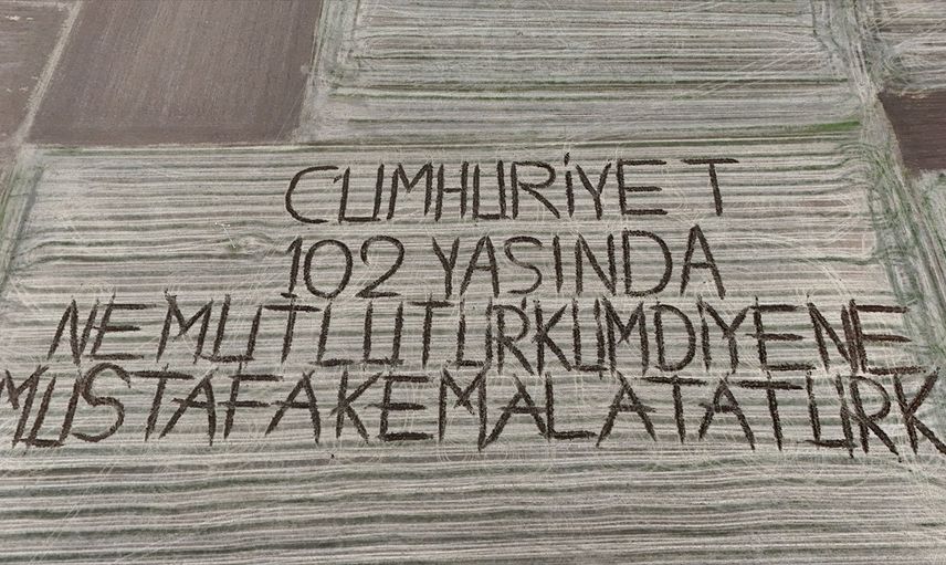 Kırklareli'nin Lüleburgaz ilçesine bağlı Evrensekiz beldesinde çiftçi Burak Tunçkol, tarlasına pullukla toprağa iz bırakarak "Cumhuriyet 102 yaşında, Ne mutlu Türküm diyene, Mustafa Kemal Atatürk" yazdı. Tunçkol, AA muhabirine açıklamada bulundu.