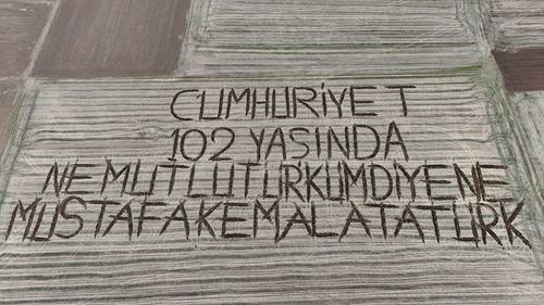 Lüleburgazlı Burak Tunçkol, Cumhuriyet'in 102. yılı anısına tarlasına pullukla 'Cumhuriyet 102 yaşında, Ne mutlu Türküm diyene, Mustafa Kemal Atatürk' yazdı.
