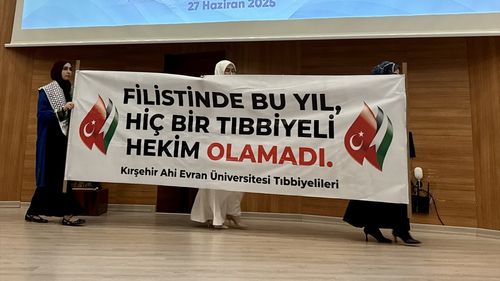 Kırşehir Ahi Evran Üniversitesi'nde mezuniyet töreninde öğrenciler, Filistin'e destek vermek için kefiye takarak pankart açtı.