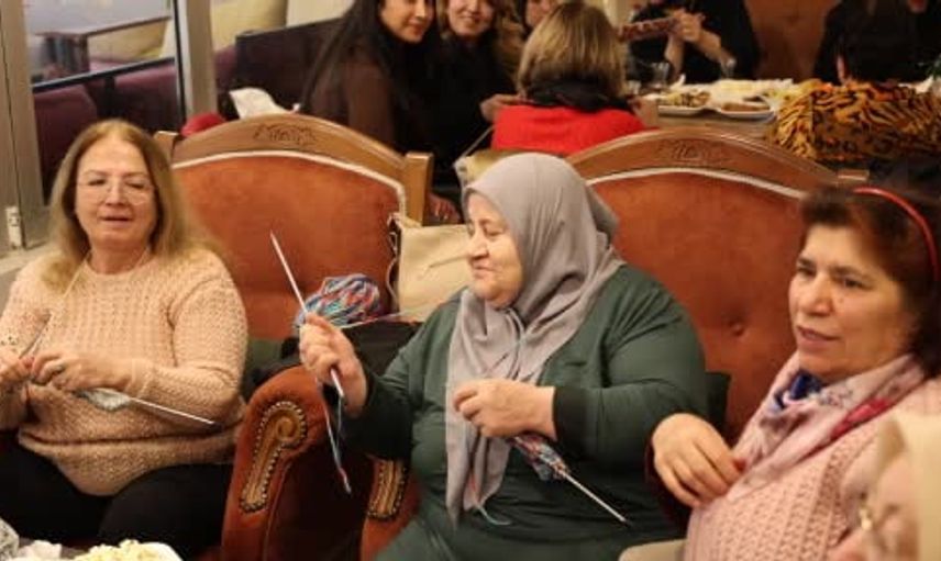 Etkinlik, bir kafeteryada düzenlenen buluşmalarla yürütülüyor; örülen ürünler toplanarak ihtiyaç sahiplerine ulaştırılmak üzere hazır hale getiriliyor.