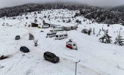 Ankara’nın Kızılcahamam ilçesinde, Işık Dağı eteklerindeki Karagöl Jeositi kar yağışıyla beyaza büründü. Doğayla iç içe bir kış tatili arayan Başkentliler, geleneksel merkezler yerine bölgeyi alternatif olarak tercih etmeye başladı.
