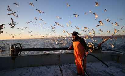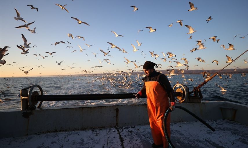 Karadeniz'e kıyısı bulunan Kırklareli'nin Vize ilçesine bağlı Kıyıköy beldesi açıklarında, balıkçı teknelerine eşlik eden martıların yiyecek bulma telaşı görüntülendi.