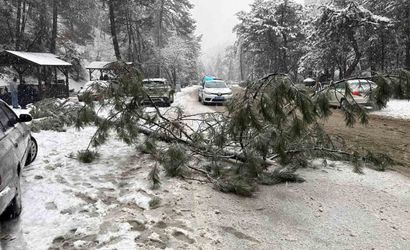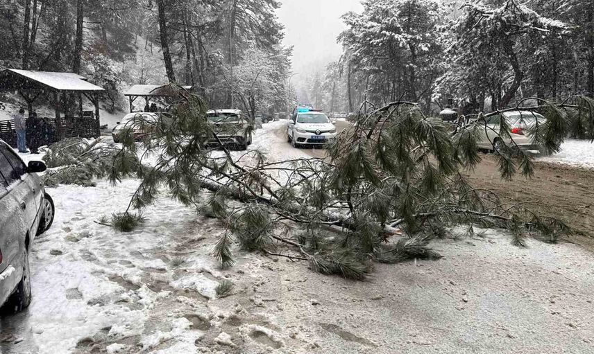 Ankara’nın Kızılcahamam ilçesinde devam eden kar yağışı sırasında, Soğuksu Milli Parkı sınırları içinde bir çam ağacı karın ağırlığını taşıyamayarak kökünden söküldü ve yola devrildi.