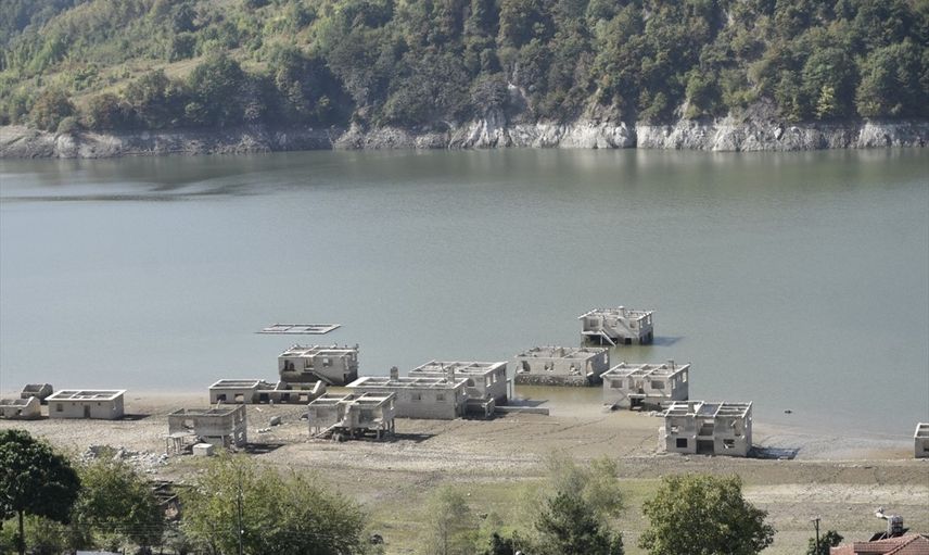 Zonguldak'ın Karadeniz Ereğli ilçesindeki Kızılcapınar Barajı'nda yüksek hava sıcaklıkları ve kuraklık nedeniyle su seviyesinin düşmesi sonucu terk edilmiş yapılardan bazıları ortaya çıktı.