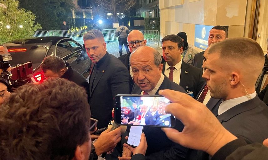 Genişletilmiş formatlı gayriresmi Kıbrıs toplantısı, Birleşmiş Milletler (BM) Genel Sekreteri Antonio Guterres'in heyet başkanları için verdiği akşam yemeğiyle başladı. Guterres tarafından bir otelde verilen yemeğe katılan Kuzey Kıbrıs Türk Cumhuriyeti (KKTC) Cumhurbaşkanı Ersin Tatar (ortada), yemeğin ardından basın mensuplarına değerlendirmelerde bulundu.