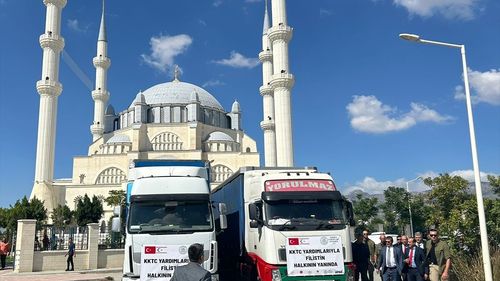 KKTC, Gazze'ye insani yardım taşıyan iki tırı dualarla uğurladı.