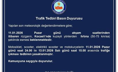 Valilik açıklamasında, yapılan son meteorolojik değerlendirmelere göre; 11.01.2026 Pazar günü akşam saatlerinden itibaren rüzgarın Kocaeli'nde kuzeyli yönlerden fırtına (50-75 km/sa) şeklinde esmesi beklendiği ifade edildi.