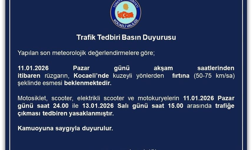 Kocaeli Valiliği, etkili olması beklenen fırtına nedeniyle motosiklet, scooter, elektrikli scooter ve motokuryelerin trafiğe çıkışının yasaklandığını bildirdi.
