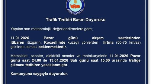 Kocaeli Valiliği, beklenen fırtına nedeniyle 11.01.2026 24:00–13.01.2026 15:00 arasında motosiklet, scooter, elektrikli scooter ve motokuryelerin trafiğe çıkışını yasakladı.