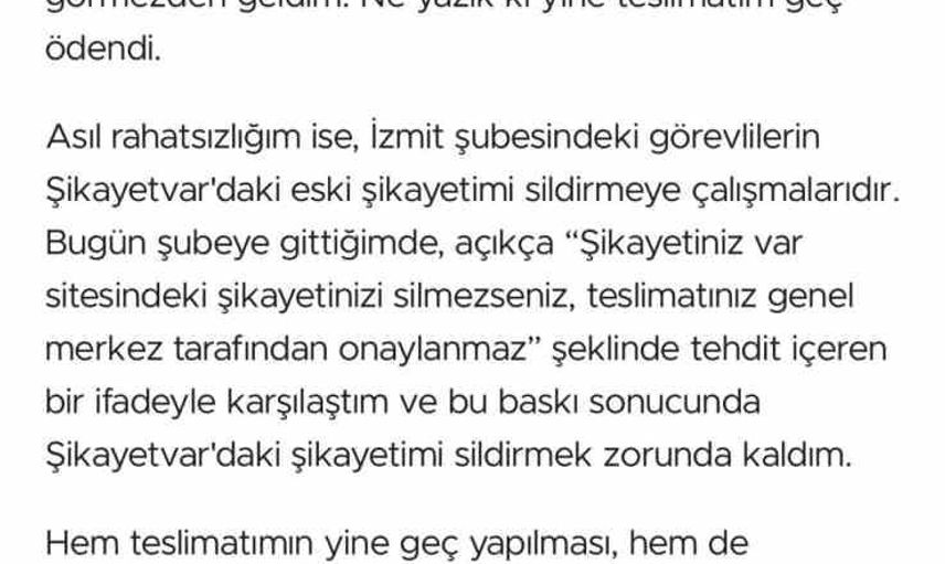 Ancak, şube çalışanlarının kendisine "Şikayetini silmezsen paranı alamazsın" şeklinde bir yanıt verdiğini söyleyen vatandaş, bu ifade karşısında şaşkınlık yaşadığını aktardı. Vatandaş ayrıca şubede kendisine yönelik bir diğer ifade olarak "Şikayetinizi silmezseniz, teslimatınız genel merkez tarafından onaylanmaz" şeklinde bir uyarı yapıldığını iddia etti.