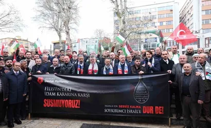 Kocaeli'de sivil toplum kuruluşları, protokol üyeleri ve çok sayıda vatandaş, İsrail Meclisinin Filistinli esirlerin idam edilmesinin önünü açan tartışmalı yasasını düzenledikleri ortak basın açıklamasıyla protesto etti.