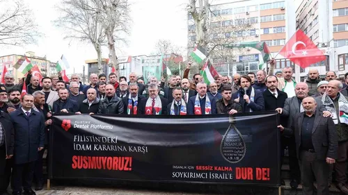 Kocaeli'de sivil toplum, protokol ve vatandaşlar, İsrail Meclisi'nin Filistinli esirlerin idam edilmesinin önünü açan tartışmalı yasasını basın açıklamasıyla protesto etti.