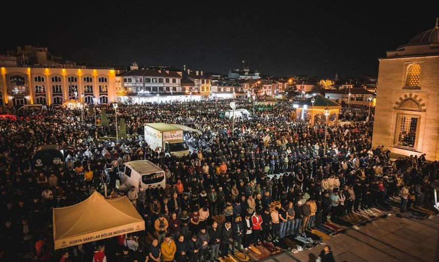 Konya'da, yatsı ezanıyla birlikte Mevlana Meydanı'ndaki Sultan Selim Camisi önünde toplanan kalabalık, birlikte teravih namazını kıldı. Müslümanlar, namazın ardından dua ederek Kadir Gecesi'nin manevi atmosferini paylaştı. Camiden çıkanlara çeşitli ikramlarda bulunuldu.