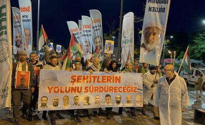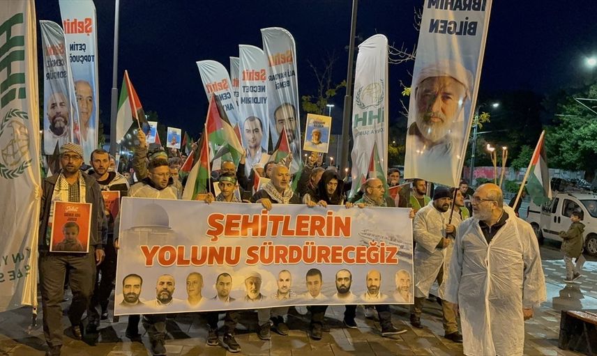 Meşaleler ve Filistin bayraklarıyla donanmış kalabalık, İsrail aleyhine sloganlar atarak yürüyüşe geçti. Kalabalık, 'Müslüman uyuma, kardeşine sahip çık' ve 'katil İsrail Filistin'den defol' sözleriyle Zafer Meydanı'na kadar ilerledi.