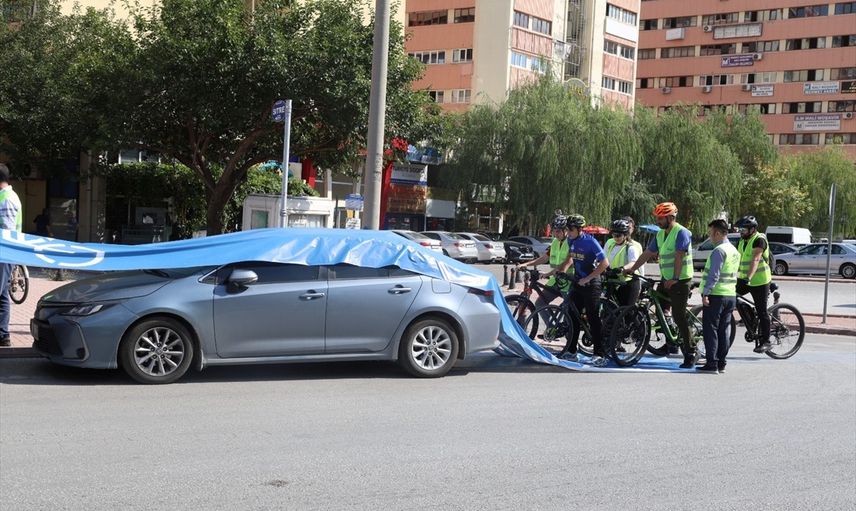 Bisikletseverler, "Avrupa Hareketlilik Haftası" kapsamında, Konya'da bisiklet yoluna park eden araçların üzerini mavi brandalarla kaplayarak farkındalık oluşturdu.