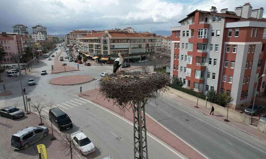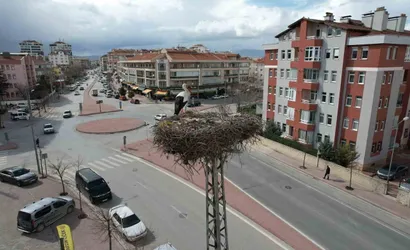 Konya şehir merkezinde baharın habercisi leylekler, bu yıl da yıllardır mesken tuttukları elektrik direğindeki yuvalarına geldi.