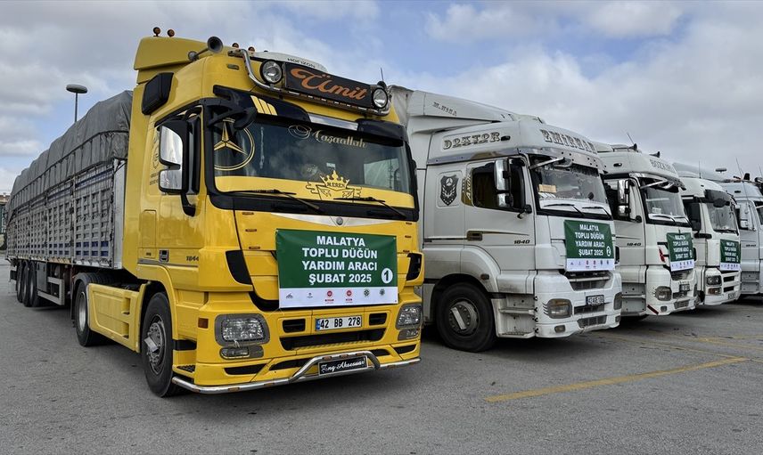 Malatya'da depremzedelere yönelik yardımlar devam ediyor. İhtiyaç sahibi 100 nişanlı çift için Konya'dan gönderilen kıyafet, halı, ev tekstili, züccaciye ve kişisel bakım ürünlerinden oluşan tırlar, Panorama Kültür Merkezi otoparkında uğurlandı.