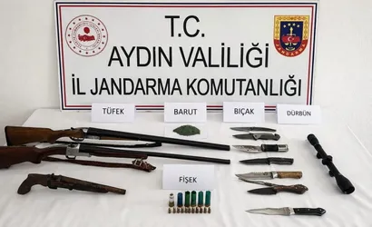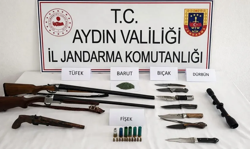 Arama sonucunda 7 adet bıçak, 3 adet ruhsatsız yarı otomatik av tüfeği, 1 adet av tüfeği dürbünü, 10 gram barut, 6 adet av tüfeği fişeği ve 11 adet 9 mm mermi ele geçirildi.