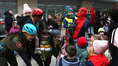 Priştine'de süper kahraman kostümü giyen dağcılar, hastanedeki çocuklara hediyeler dağıtarak onları sevindirdi.