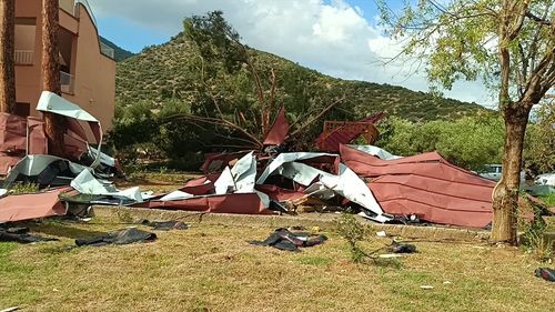 Adana'nın Kozan ilçesinde etkili fırtına, Kozan Bucak Çok Programlı Anadolu Lisesi'nin çatılarının uçmasına ve park halindeki araçlara zarar vermesine neden oldu.