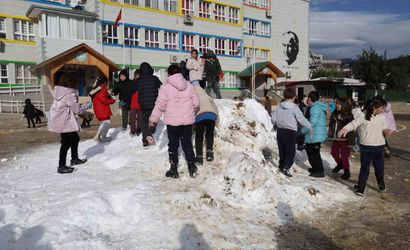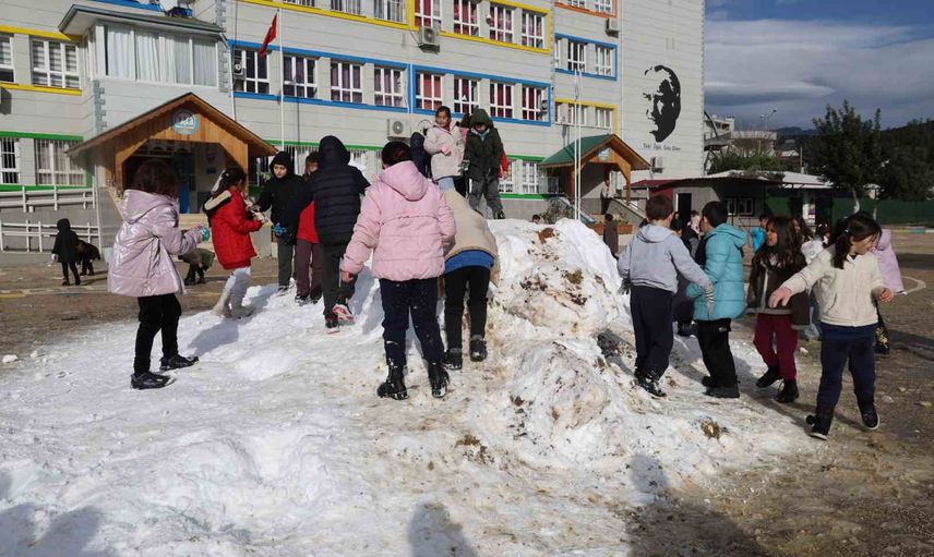 Toroslar'dan getirilen karla öğrenciler bahçede kar keyfi yaşadı