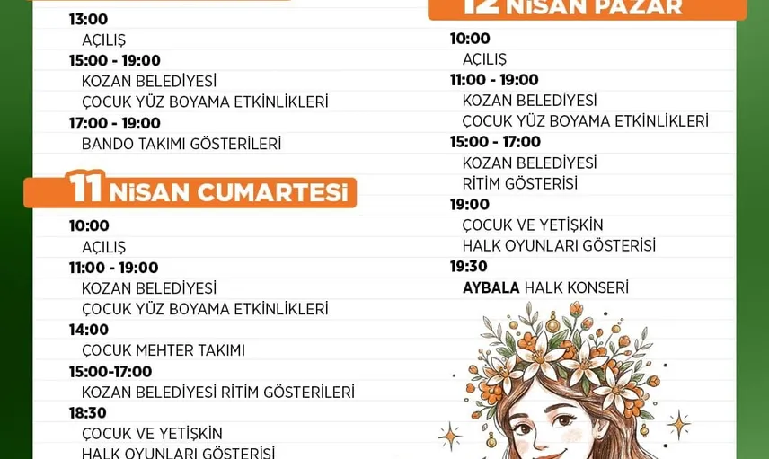 10-12 Nisan tarihleri arasında Adana'nın Kozan ilçesinde düzenlenecek Kozan Portakal Çiçeği Festivali için hazırlıklar tamamlandı. Festival, tarihi çarşı sokaklarında ve portakal bahçeleriyle çevrili mekanlarda ziyaretçileri ağırlayacak.