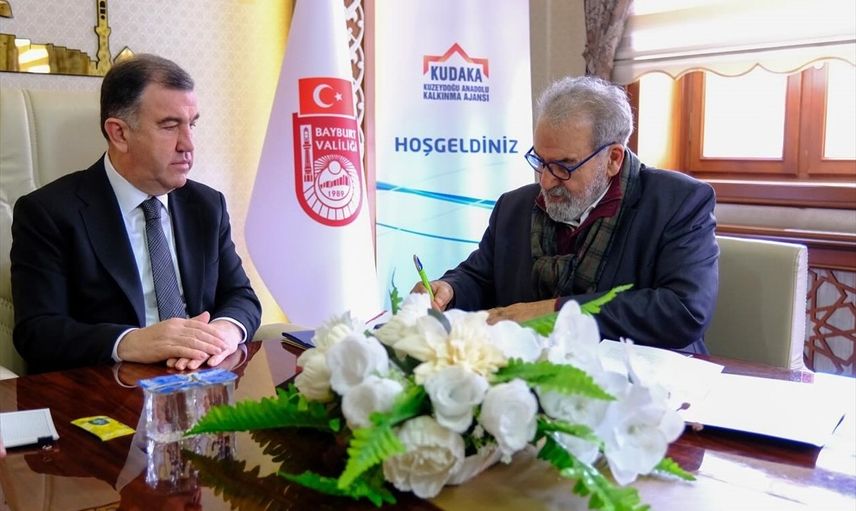 Kuzeydoğu Anadolu Kalkınma Ajansı (KUDAKA), Bayburt'ta iki projeye toplam 12 milyon 26 bin 647 lira destek verecek. Sosyal Gelişmeyi Destekleme Programı kapsamında İl Tarım ve Orman Müdürlüğünce hayata geçirilecek "Bayburt Ekoköy-2" ile Baksı Kültür Sanat Vakfının "Ehramdan Geleceğe Çağrı" projelerine ilişkin destek sözleşmesi imzalandı. Vali Mustafa Eldivan (ortada) başkanlığında KUDAKA Genel Sekreteri Oktay Güven (solda) ve Baksı Müzesi Kurucusu Hüsamettin Koçan (sağda) arasında sözleşme imzalandı.