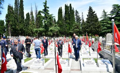 Trabzon, Ordu ve Artvin'de Kurban Bayramı arifesinde şehitlikler ziyaret edildi. Trabzon'da Sülüklü Asri Mezarlığı'ndaki Trabzon Şehitliği'ni ziyaret eden Vali Aziz Yıldırım (sağ 2) ve protokol üyeleri, mezarlara kırmızı karanfil bıraktı.