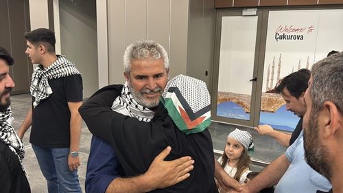 Küresel Sumud Filosu'nda alıkonulan Medeniyet Vakfı Adana Şube Başkanı Muhammed Emin Işık, THY ile Türkiye'ye döndü; Mersin'de karşılandı ve ardından Adana'ya uğurlandı.