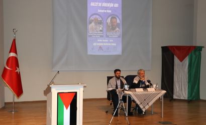 İyilik Öncüleri Kulübü ve İyilik Derneğince, Ağrı İbrahim Çeçen Üniversitesi Kültür ve Kongre Merkezi'nde Gazze'ye insani yardım için yola çıkan Küresel Sumud Filosu’nda bulunan aktivist Ağrılı iş insanı aktivist Umut Aslan (sağda) ve araştırmacı yazar aktivist Davut Daşkıran'ın (sağ 2) katılımıyla "Gazze'de Direnişin Adı Sumud'un Ruhu Konferansı" yapıldı.