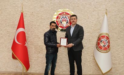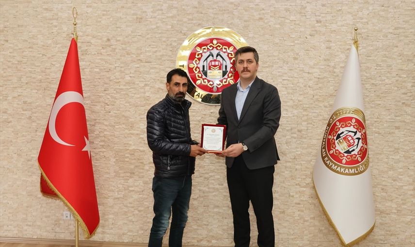 Siirt'in Kurtalan ilçesinde 10 katlı binada çıkan yangında, yüksek katlarda mahsur kalanları nakliye asansörleriyle tahliye eden firma yetkilisi Takyeddin Gülmez'e (solda), Kurtalan Kaymakamı Samet Serin (sağda) tarafından plaket verildi.