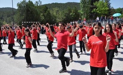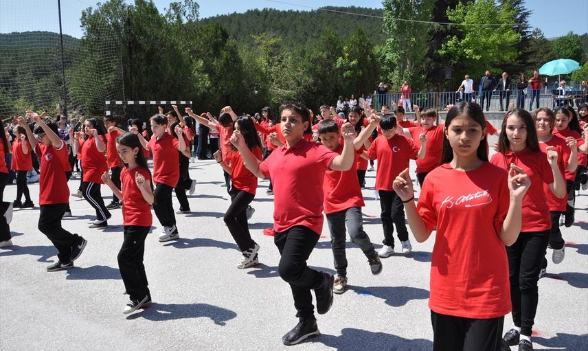 Kütahya'daki Şehitler Ortaokulu'nda, 19 Mayıs Atatürk'ü Anma, Gençlik ve Spor Bayramı dolayısıyla düzenlenen törende 100'den fazla öğrenci hep birlikte harmandalı oynayıp, halay çekti.