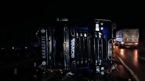 Kütahya-Sofça yakınlarında sağanak nedeniyle 07 TBZ 44 plakalı meyve yüklü tır devrildi; sürücü yara almadı, yol ekip müdahalesiyle kontrollü açıldı.