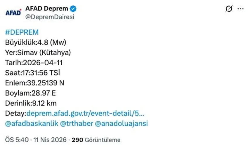AFAD verilerine göre, saat 17.31'de Kütahya'nın Simav ilçesi merkezli deprem 4.8 büyüklüğünde kaydedildi. Sarsıntı, Bursa ve ilçelerinden de hissedildi.