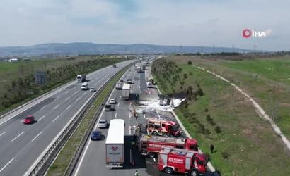 Kuzey Marmara Otoyolu'nun Çatalca ilçesi Nakkaş mevkiinde, Edirne istikametinde seyir halindeki köpük sprey yüklü kamyonun alev alması sonucu otoyolda trafik aksadı. Olayda kamyon kasasında bulunan spreylerin art arda patlaması, çevrede panik yaşanmasına neden oldu.