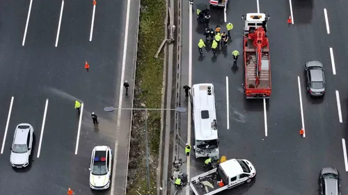 Kuzey Marmara Otoyolu’nda servis kazası: 1 polis şehit oldu, 16 yaralıKuzey Marmara Otoyolu’nun Başakşehir - Habipler bağlantı yolunda meydana gelen kazada, polisleri taşıyan servis minibüsü ile bir otomobil çarpıştı. Olay yerinin dron ile kaydedilen görüntüleri, kazanın etkilerini ve ekiplerin müdahalesini…