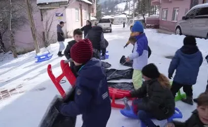 Samsun'un Ladik ilçesinde sömestr tatilini fırsat bilen çocuklar, Koğa Mahallesi Ulubatlı Hasan Sokak'ta bulunan ve mahalleli tarafından 'Muhtarın Yokuşu' olarak adlandırılan yolda kızakla kayarak karın tadını çıkardı.